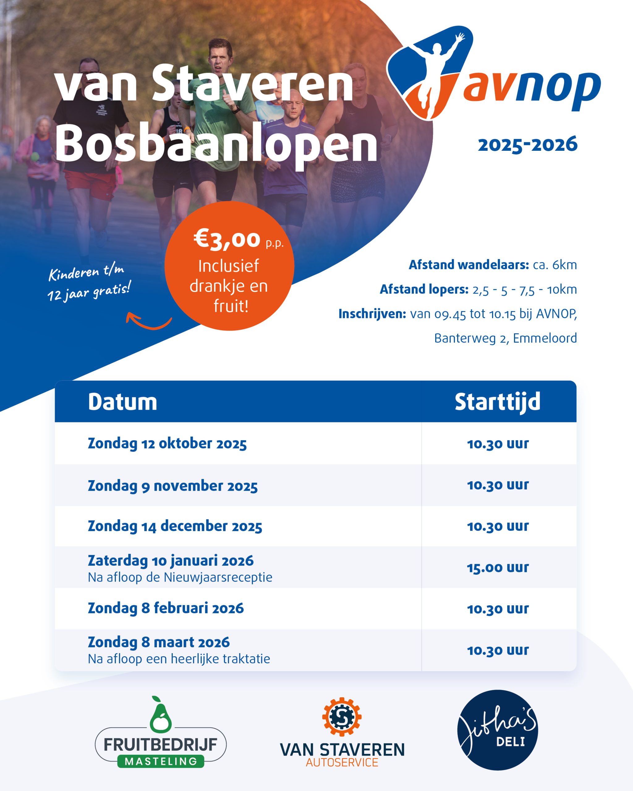 Van Staveren Bosbaanloop Zondag 8 februari 2026 | Start 10.30 uur | Emmeloord Op zondag 8 februari 2026 staat de volgende editie van de Van Staveren Bosbaanlopen op het programma. Een sportieve en gezellige ochtend in het Emmelerbos, geschikt voor zowel fanatieke hardlopers als recreatieve wandelaars. Afstanden Hardlopers: 2,5 – 5 – 7,5 – 10 […]