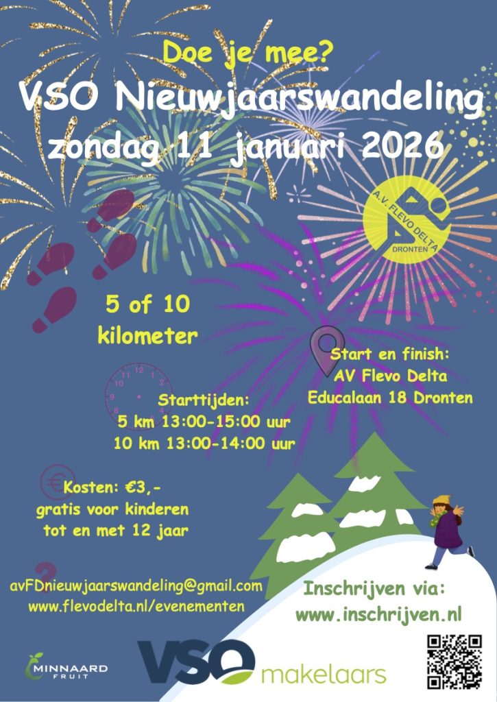 Start het jaar sportief met de VSO Nieuwjaarswandeling 2026 AV Flevo Delta organiseert ook dit jaar de gezellige en sportieve VSO Nieuwjaarswandeling. Op zondag 11 januari 2026 kunnen deelnemers het nieuwe jaar fris beginnen met een mooie wandeling vanaf Educalaan 18 in Dronten. Toegankelijke 5 km én nieuwe 10 km route Na het succes van […]