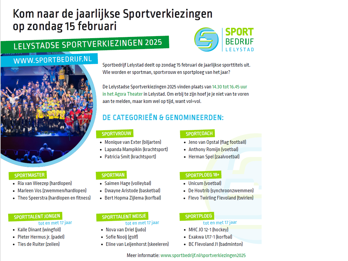 Veel Lelystadse sporters hebben in 2025 een bijzondere prestatie geleverd en dat verdient een podium. Daarom organiseert Sportbedrijf Lelystad op zondag 15 februari 2026 de Lelystadse Sportverkiezingen 2025. Een feestelijke middag waarin sport, talent en succes centraal staan. Tijdens het evenement worden de Lelystadse sporttitels uitgereikt en vindt de Kampioenenparade plaats voor alle jeugdkampioenen tot […]